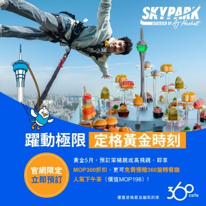 立即預訂笨豬跳/高飛跳的「黃金五月套票」,即省$300! 每位再免費獲贈澳門旅遊塔360°旋轉餐廳下午茶乙份!從上一秒挑戰高空極限,到下一秒悠享精緻茶點,輕鬆拍出極致反差感,完美解銷動靜雙重的黃金時刻。